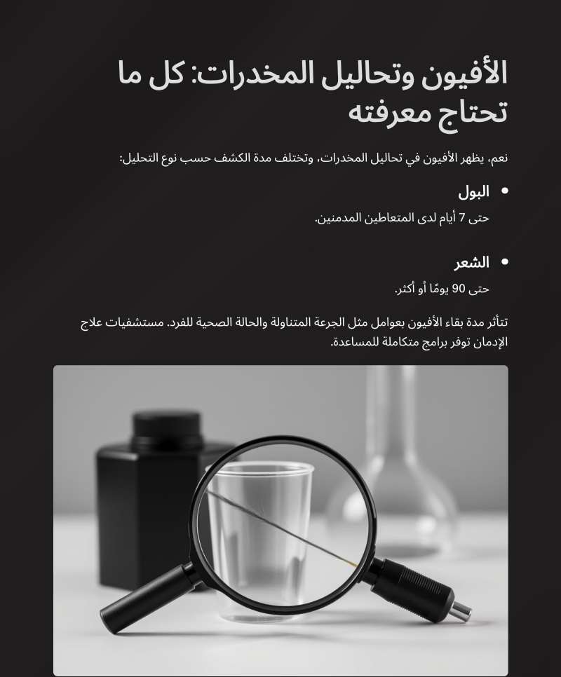 الأفيون يظهر في تحليل المخدرات بسهولة، خاصة في البول والشعر، مما يجعل الكشف عن الإدمان ممكنًا بدقة.